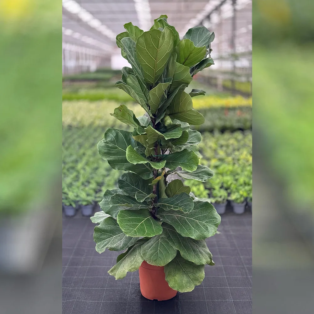 Name: Ficus lyrata, or fiddle tree. Scientific name: Ficus lyrata Description: It is a popular indoor plant characterized by its large leaves that resemble the shape of a violin. Its dark green leaves with wavy edges add a dramatic and aesthetic appearance to any interior space. It is a popular plant in modern interior designs due to its beauty and size that can reach great heights in the right conditions. Its original habitat: West Africa Produced in the Kingdom of Saudi Arabia (Al Bustan Nurseries) Height: 150 cm Pot capacity: 12 liters Pot diameter: 26 cm Number of sticks: 3